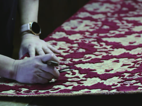 旧高野口町を中心とした地域で生産される高野口パイル。幅広い製品に使われる、このラグジュアリーな生地を展示、製品も販売する。